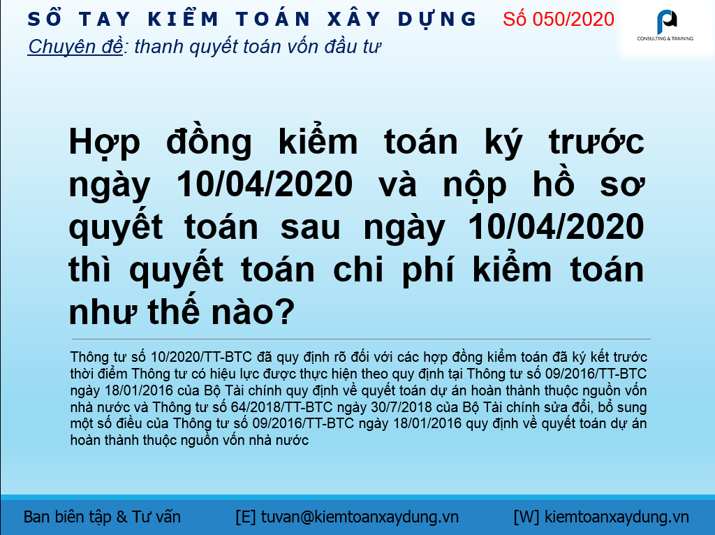 Hợp đồng kiểm toán ký trước ngày 10/04/2020 và nộp hồ sơ quyết toán sau ngày 10/04/2020 thì quyết toán chi phí kiểm toán như thế nào?