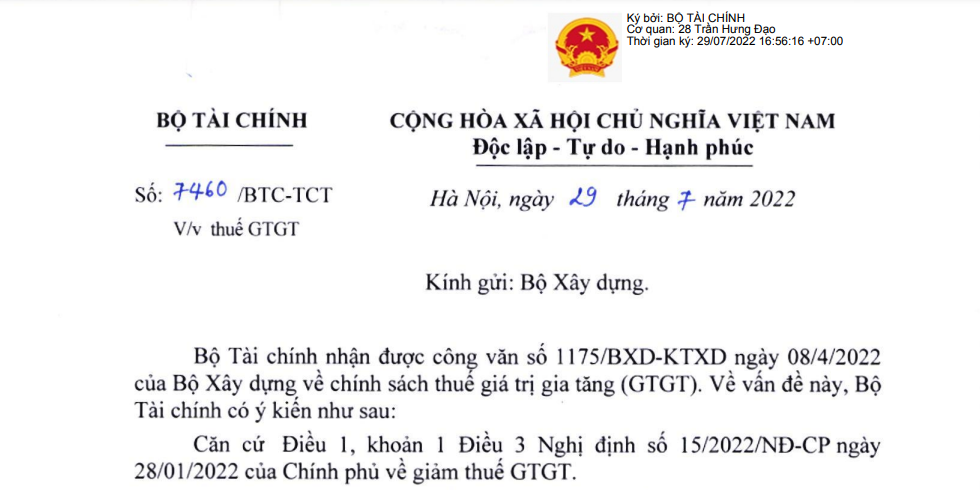 Văn bản số 7460/BTC-TCT ngày 29/07/2022 của Bộ Tài chính gửi Bộ Xây dựng về chính sách giảm thuế GTGT