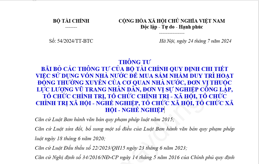 Thông tư 54/2024/TT-BTC: Bãi bỏ các quy định cũ về mua sắm công, hoạt động...